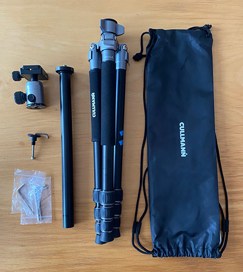 Das Cullmann Mundo 525M Dreibeinstativ Dreibein Stativ ist in vier Farben erhältlich (Silber, Schwarz, Rot, Blau). Wir haben uns im Test für die Variante in Silber entschieden. Das Stativ ist sehr solide verarbeitet und kommt einer schwarzen Schutzhülle zum Umhängen, einem Aluminium Kugelkopf mit Kamera Schnell-Verschluss.