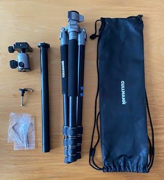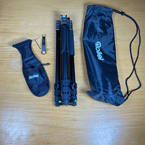 Das Stativ kann bis zu einer Höhe von 158 cm ausgezogen werden und hat eine Tragfähigkeit von bis zu 8 kg. Das Besondere an diesem Stativ ist, es ist deutlich leichter als seine baugleiche Variante. Das Stativ kommt mit einem Stativbeutel, Werkzeug sowie einem kleinen Adapter.